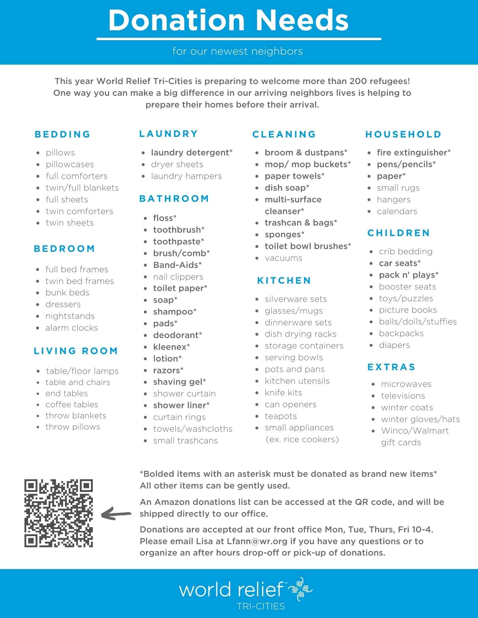 Some of our ongoing items that are needed when setting-up an apartment for new refugee arrivals into the Tri-Cities: (*Bolded items are presently in need due to high volume of arrivals)